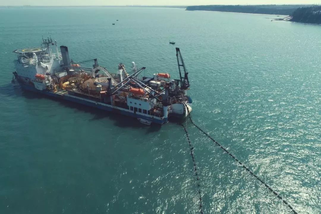 裝有電纜的大型敷設(shè)船吃水太深,到淺海區(qū)域就會擱淺。還需要另一艘小型駁船做淺海敷設(shè)。(李品 宋印官 攝)