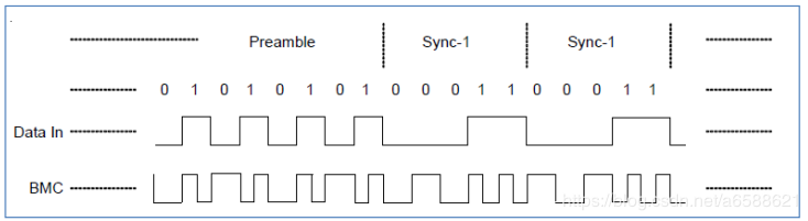 BMC碼是一種單線通信編碼,數(shù)據1的傳輸,需要有一次高/低電平之間的切換過程,而0的傳輸則是固定的高電平或者低電平。每一個數(shù)據包都包含有0/1交替的前置碼,起始碼(SOP),報文頭,數(shù)據位,CRC以及結束碼(EOP)