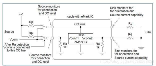 我們注意到,線纜中有1K的下拉電阻Ra,這樣在線纜插入的時候,Source會識別到CC1和CC2電壓下降的情況,具體的電壓會告訴主機那個端子被Sink的5.1K下拉,那個端子被線纜的1K電阻下拉。因此線纜的插入方向也可以被識別到。Source就可以通過開關,給E-Marker提供VCONN。