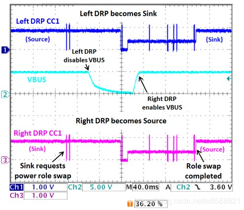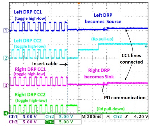 當設備為DRP時,設備的CC1和CC2為方波,一旦連接,CC端都會發(fā)生改變。