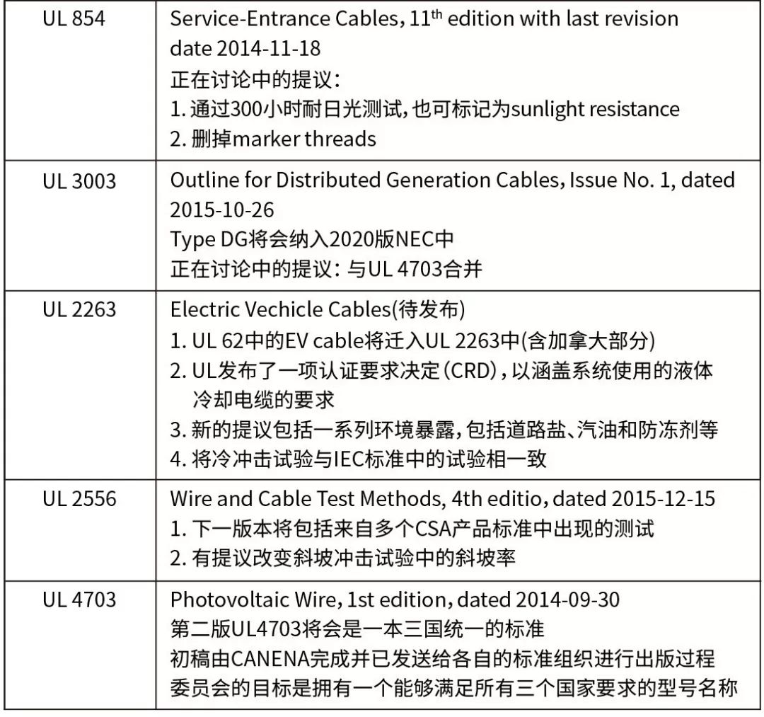 電線電纜相關(guān)的標準 在這些標準中,一部分為產(chǎn)品標準,即明確定義了產(chǎn)品適用范圍、等級參數(shù)、規(guī)格結(jié)構(gòu)、測試要求、測試條件和標志等。包括: 還有一些標準是測試標準,當產(chǎn)品標準中提及參照某本測試標準做測試時,我們需依據(jù)測試標準進行測試。如: 電線電纜標準更新與發(fā)展動向 1. 最近發(fā)布的新標準 2. 正在制定中的新大綱和標準 3. 正在處理中的標準修訂提案 4. 標準修訂