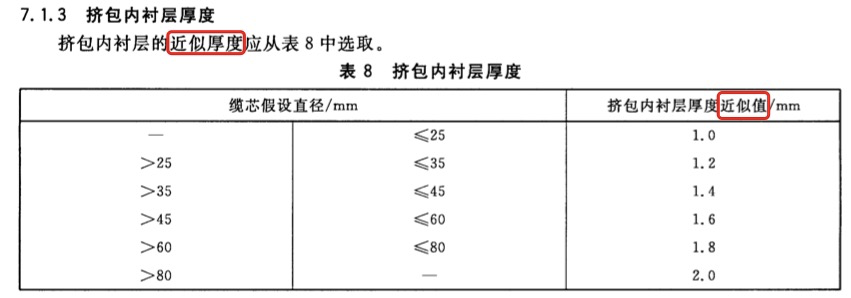 當采用金屬帶鎧裝和符合7.2規(guī)定的繞包內襯層時,內襯層應采用包帶墊層加強。如果鎧裝金屬帶厚度為0.2 mm,內襯層和附加包帶墊層的總厚度應按7.2的標稱值再加0.5 mm;如果鎧裝金屬帶厚度大于0.2 mm,內襯層和附加包帶墊層的總厚度應按7.2的標稱值再加0.8 mm。