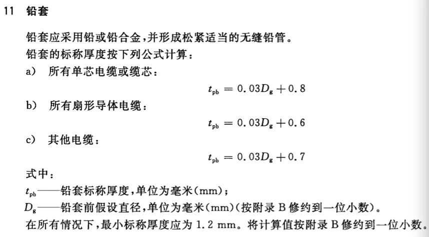 絕緣最小厚度 非金屬護套最小厚度 擠包內襯層最小厚度 繞包內襯層厚度 繞包內襯層和包帶墊層總厚度 鉛套最小厚度 鎧裝金屬絲最小直徑 鎧裝金屬線最小厚度 鎧裝金屬帶最小厚度 屏蔽銅帶最小厚度 | mm | 修約到百分位 | 修約到百分位 |