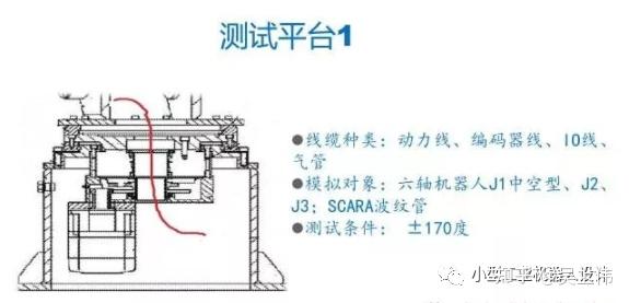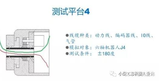 而實際上的機器人狀況是多種不同線纜加氣管、多種不運動的組合,所以我們當時的做法是,根據(jù)企業(yè)自身的產(chǎn)品把對機器人分成不同的關(guān)節(jié)運動,然后把機構(gòu)簡化變成線纜測試平臺。這是在初期投入很少的測試,而當產(chǎn)品豐富之后,最直接的當然是直接上機器人測試,或者使用機器人進行改造變成測試平臺,因為標準機器人因為外面有防護殼等,要停機檢測不太方便。