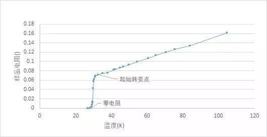 由圖可知,隨著溫度逐漸降低,樣品電阻逐漸降低,到達起始轉變點后,電阻迅速降低,達到零電阻溫度時電阻完全變?yōu)?.