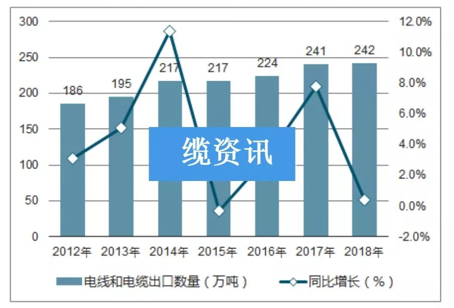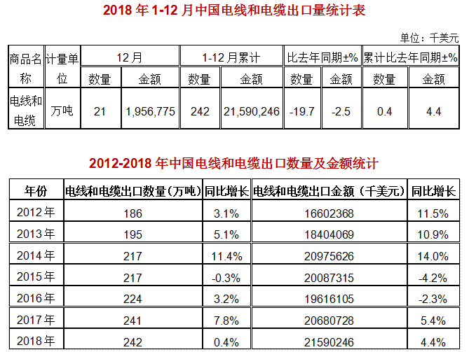 據(jù)中國海關(guān)數(shù)據(jù)顯示:2018年1-12月中國電線和電纜出口數(shù)量為242萬噸,同比增長0.4%,增速較上一年下降7.4%;2018年1-12月中國電線和電纜出口金額為21590246千美元,同比增長4.4%,增速較上一年微降1個點。