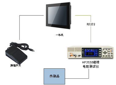 絕緣電阻測試系統(tǒng)由防爆一體機(jī)、HP3530絕緣電阻測試儀、待測絕緣電阻及腳踏開關(guān)組成。
